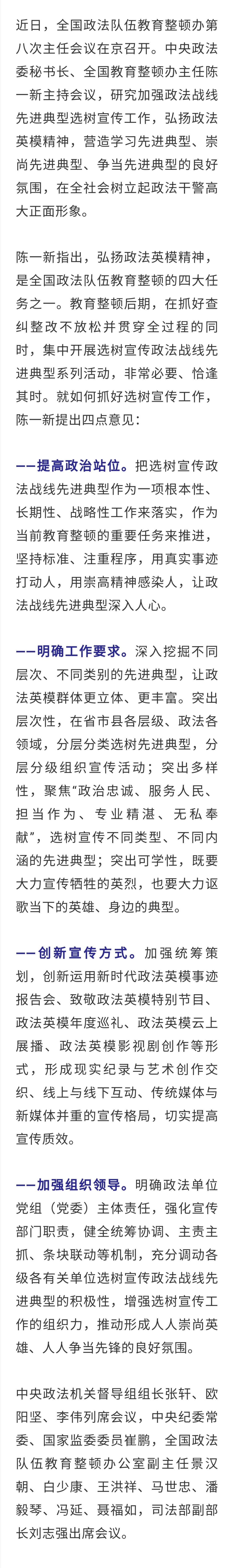 陈一新在全国政法队伍教育整顿办第八次主任会议上强调 加强政法战线先进典型选树宣传 大力弘扬政法英模精神