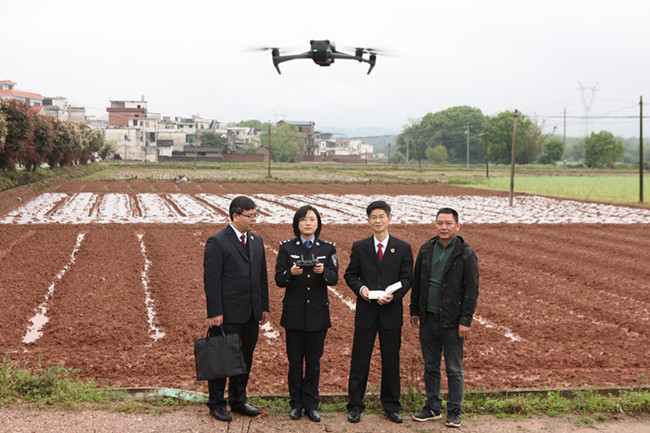 3月29日,江西省信丰县检察院干警来到该县大阿镇光明村,开展耕地保护公益诉讼专项监督活动。图为检察技术人员用无人机航拍耕地复耕整改情况。人人看球日报通讯员刘健 李娴 姚卫东摄
