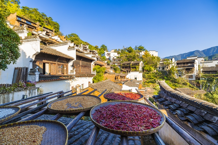 白墙黛瓦杏叶,世外桃源晒秋忙。上饶市婺源县古村落是中国古建筑保存最完好的地方之一,以“中国最美的乡村”闻名。粉墙、黛瓦、飞檐斗角遍布各村,“三雕”繁复细腻。秋分时节,村民们把丰收的食材放在竹匾或平地上晾晒,火红的辣椒,金黄的玉米,橘黄的南瓜……粉墙黛瓦的山城民居仿佛披上了五彩斑斓的丰收外套,构成了独属于秋天的色彩,绘就出世界独一无二的“晒秋”农俗景观。