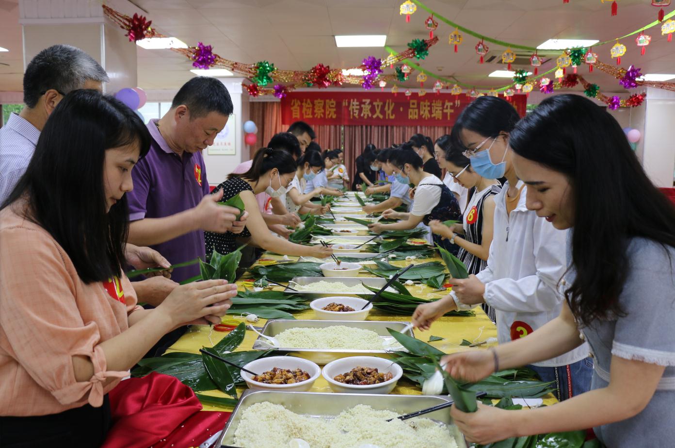 参加竞赛的既有60后“资深”干警代表,也有90后检察干警“新秀”,四代检察人齐聚一堂,包粽子、话端午。从检30多年的老检察人说:“端午节亲手包粽子,是我们这一代人共同的美好回忆。许多年轻人都来参加比赛,这真的很好,可以一代又一代地传承中华民族的传统文化”。入院不久的年轻检察干警说道:“其实我们并不太会包粽子,但是粽子代表了端午节,代表了中华民族的传统节日和优秀传统文化,作为年轻人,我们既要学习了解,也有责任一棒接一棒传承下去。”