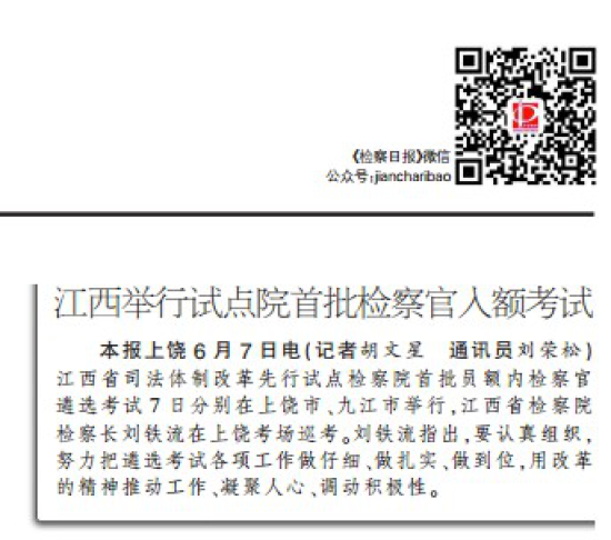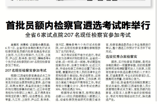 【编者按】6月7日,江西省检察机关举行试点院首批检察官入额考试。新闻处积极协调中央和省内主流媒体。目前人人看球日报、江西卫视、新法制报、人民网、法制网、正义网、江西政法网等媒体对活动进行集中宣传报道。